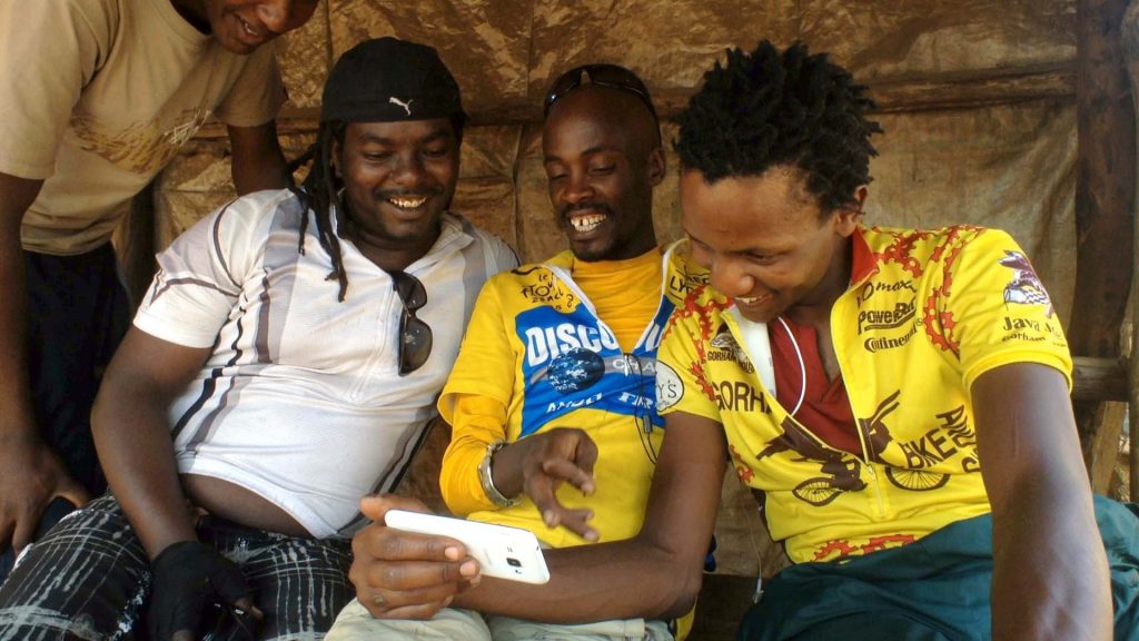 „Baze“ orientiert sich an informellen Treffpunkten in Nairobi, wo junge Menschen hohe Datenkosten vermeiden, indem sie Dateien direkt von Handy zu Handy austauschen und so ein stadtweites „Sneakernet“ schaffen.